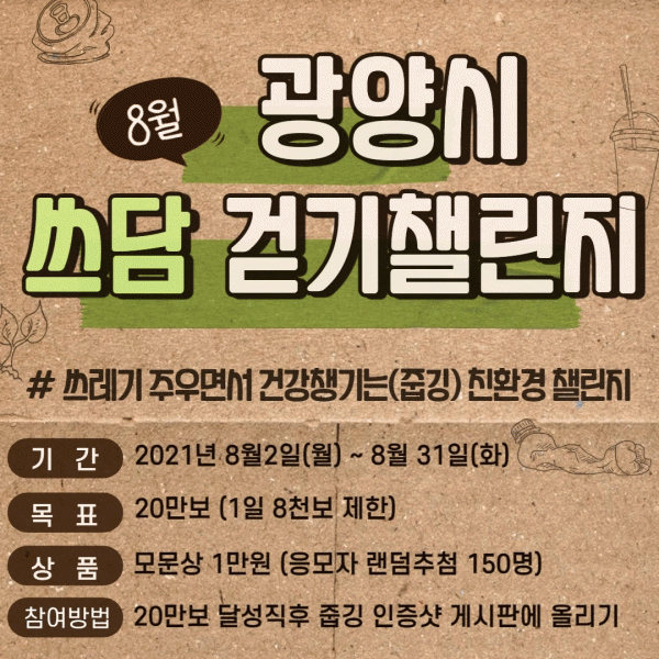 [¹Ìµð¾îÀü³² ÀÓ¼º¿Ï ±âÀÚ] ±¤¾ç½Ã°¡ ¿À´Â 8¿ù 2~31ÀÏ Äڷγª19 Àå±âÈ·Î ÁöÄ£ ½Ã¹ÎÀÇ Ã¼·ÂÀ» ÁõÁøÇϰí ȯ°æÁ¤È Ȱµ¿µµ ÇÔ²² ½ÇõÇÒ ¼ö ÀÖ´Â 1¼® 2Á¶ÀÇ ¡®¾²´ã °È±â縰Áö¡¯¿Í ¡®¿©¸§ °È±â縰Áö¡¯¸¦ µ¿½Ã¿¡ ÁøÇàÇÑ´Ù. ¡®¾²´ã °È±â¡¯¶õ¡¦