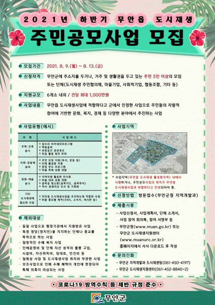 [¹Ìµð¾îÀü³² ±èÆÇ±¹ ±âÀÚ] ¹«¾È±ºÀº ÁֹΠ°øµ¿Ã¼ Ȱ¼ºÈ ±â¹ÝÀ» ¸¶·ÃÇϰí Áö¼Ó°¡´ÉÇÑ µµ½ÃÀç»ýÀ» µµ¸ðÇϰíÀÚ 2021³â ÇϹݱ⠹«¾ÈÀ¾ µµ½ÃÀç»ý Áֹΰø¸ð»ç¾÷ Âü¿©´Üü¸¦ ¸ðÁýÇÑ´Ù. ½ÅûÀÚ°ÝÀº ¹«¾È±º¿¡ ÁÖ¼ÒÁö³ª °ÅÁÖ¡¤»ýȰ±ÇÀ» µÐ ÁֹΠ5¡¦