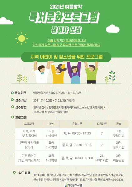 [¹Ìµð¾îÀü³² Á¦°¥´ëÁ¾ ±âÀÚ] °Áø±ºµµ¼°üÀÌ ¿©¸§¹æÇÐÀ» ¸Â¾Æ °ü³» Ãʵ°íµîÇлýµéÀ» ´ë»óÀ¸·Î 7¿ù 26ÀϺÎÅÍ 8¿ù 20ÀϱîÁö ¹«·á µ¶¼¹®ÈÇÁ·Î±×·¥À» ÁøÇàÇÑ´Ù. À̹ø µ¶¼¹®ÈÇÁ·Î±×·¥Àº `¹ÙµÏ,ÀÌÁ¦ ù °ÉÀ½À̾ß`, ¡®³ª¸¸ÀÇ Ä³¸¯Å͸¦ ¡¦