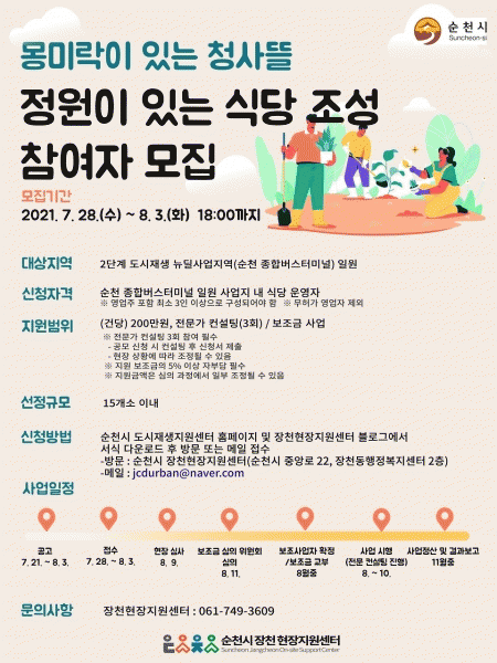 [¹Ìµð¾îÀü³² ÀÓ¼º¿Ï ±âÀÚ] ¼øÃµ½Ã°¡ µµ½ÃÀç»ý»ç¾÷ÀÇ ÀÏȯÀ¸·Î ¡®Á¤¿øÀÌ ÀÖ´Â ½Ä´ç¡¯À» ¸¸µç´Ù. ½Ã´Â Á¾ÇÕ¹ö½ºÅ͹̳ΠÀÏ¿ø µµ½ÃÀç»ý Ȱ¼ºÈ»ç¾÷ ±¸¿ªÀÇ µµ½Ã°æ°ü ¹× ȯ°æ °³¼±À» À§ÇØ ¿À´Â 8¿ù 3ÀϱîÁö ¡®Á¤¿øÀÌ ÀÖ´Â ½Ä´ç¡¯ Á¶¼º»ç¾÷ Âü¡¦