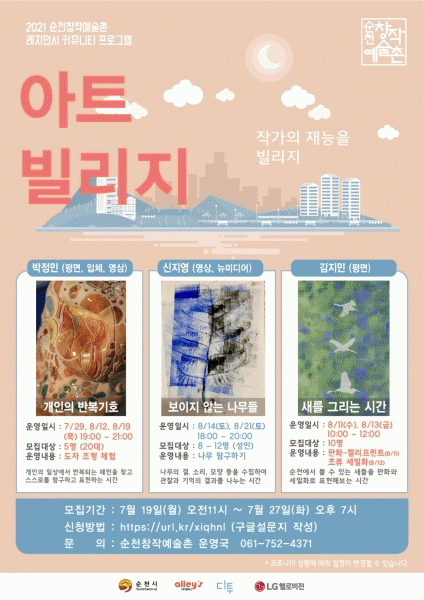[¹Ìµð¾îÀü³² ÀÓ¼º¿Ï ±âÀÚ] ¼øÃµ âÀÛ¿¹¼úÃÌ ¡®Àå¾ÈâÀÛ¸¶´ç¡¯Àº ¿À´Â 27ÀϱîÁö 2021³â ·¹Áö´ø½Ã ÀÔÁÖÀÛ°¡ ½Ã¹Î Ä¿¹Â´ÏƼ ÇÁ·Î±×·¥ ¡®¾ÆÆ®ºô¸®Áö¡¯ Âü¿©ÀÚ¸¦ ¸ðÁýÇÑ´Ù. À̹ø ¡®¾ÆÆ®ºô¸®Áö¡¯´Â Àå¾ÈâÀÛ¸¶´ç 2±â ÀÔÁÖÀÛ°¡ÀÎ ¹ÚÁ¤¹Î, ½ÅÁö¡¦