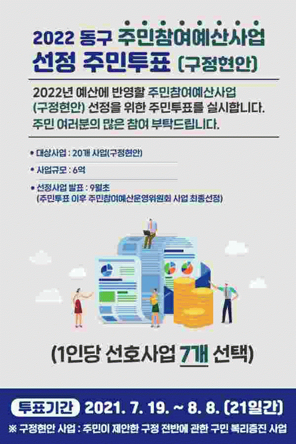 [¹Ìµð¾îÀü³² ±èÁ¤¿ì ±âÀÚ] ±¤ÁÖ µ¿±¸´Â 2022³â ÁÖ¹ÎÂü¿©¿¹»ê»ç¾÷ ¼±Á¤À» À§ÇÑ ¿Â¶óÀÎ ÁÖ¹ÎÅõÇ¥¸¦ 19ÀϺÎÅÍ 8¿ù 8ÀϱîÁö ½Ç½ÃÇÑ´Ù°í ¹àÇû´Ù. ¿ÃÇØ ÁÖ¹ÎÂü¿©¿¹»ê »ç¾÷ °ø¸ð¿¡´Â ÃÑ 113°ÇÀÇ »ç¾÷ÀÌ Á¦¾ÈµÆÀ¸¸ç »ç¾÷ºÎ¼ÀÇ Á¦¾È»ç¾÷ °ËÅä ¹×¡¦