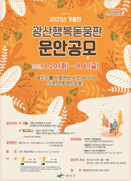[¹Ìµð¾îÀü³² ±èÁ¤¿ì ±âÀÚ] ±¤ÁÖ ±¤»ê±¸°¡ °¡À»Æí ¡®±¤»êÇູµ¸¿òÆÇ¡¯ ¹®¾ÈÀ» °ø¸ðÇÑ´Ù. 20ÀϺÎÅÍ 8¿ù6ÀϱîÁö °¡À»À» ÁÖÁ¦·Î ÇÏ´Â °¨¼º¹®±¸¿Í Å»Äڷγª ÀÀ¿ø¹®±¸ µÎ °¡Áö¸¦ °ø¸ðÇÑ´Ù. °¡À»ÀÇ Á¤Ã븦 ´ã¾Æ ½Ã¹Îµé¿¡°Ô Èñ¸Á°ú ÇູÀ» ÀüÇÏ¡¦