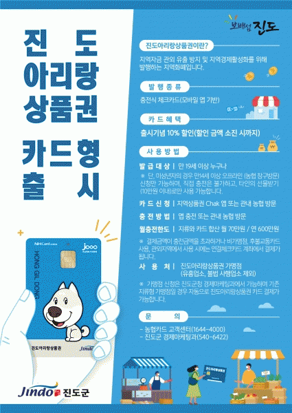 [¹Ìµð¾îÀü³² Á¦°¥´ëÁ¾ ±âÀÚ] Áøµµ±º Áö¿ª ÈÆó Áøµµ ¾Æ¸®¶û»óǰ±ÇÀÌ ¿À´Â 21ÀϺÎÅÍ ÃæÀüÀÌ °¡´ÉÇÑ Ä«µåÇüÀ¸·Î Ãâ½ÃµÇ°í ¸ð¹ÙÀÏ ¼ºñ½ºµµ ÇÔ²² ½ÃÀÛÇÑ´Ù. Áøµµ¾Æ¸®¶û»óǰ±Ç Ä«µå´Â ÃæÀüÇü üũīµå Çü½ÄÀ¸·Î ¸¸ 19¼¼ ÀÌ»óÀÌ¸é ´©±¸³ª ¡¦