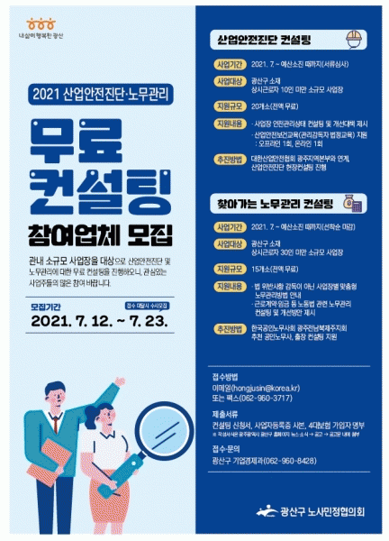 [¹Ìµð¾îÀü³² ±èÁ¤¿ì ±âÀÚ] ±¤ÁÖ ±¤»ê±¸ ³ë»ç¹ÎÁ¤ÇùÀÇȸ°¡ Áö¿ª ¼Ò±Ô¸ð »ç¾÷ÀåÀ» ´ë»óÀ¸·Î »ê¾÷¾ÈÀüÁø´Ü ÄÁ¼³ÆÃÀ» ÃßÁøÇÑ´Ù°í ¹àÇû´Ù. À̹ø »ç¾÷Àº °í¿ë³ëµ¿ºÎ °ø¸ð·Î ¼±Á¤µÈ ¡®2021³â Áö¿ª ³ë»ç¹ÎÁ¤ Çù·ÂȰ¼ºÈ »ç¾÷¡¯ ÀÏȯÀ¸·Î ÀÌ·ïÁø¡¦