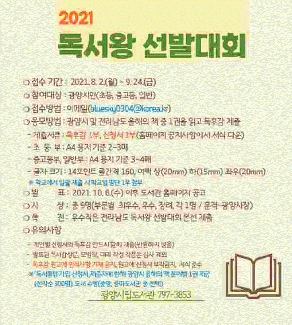 [¹Ìµð¾îÀü³² ÀÓ¼º¿Ï ±âÀÚ] ±¤¾ç½Ã°¡ ¿ÃÇØÀÇ Ã¥ Àбâ È®»ê°ú ±Û¾²±â ¿ª·®°È¸¦ À§ÇØ ¿À´Â 8¿ù 2ÀϺÎÅÍ ¡®2021 µ¶¼¿Õ ¼±¹ß´ëȸ¡¯¸¦ °³ÃÖÇÑ´Ù. µ¶¼¿Õ ¼±¹ß´ëȸ´Â µ¶Èݨ °ø¸ðÀüÀ¸·Î ÃʵîºÎ, Áß¡¤°íµîºÎ, ÀϹݺΠ¼¼ ºÎ¹®À¸·Î ³ª´² ¿¸®¸ç¡¦