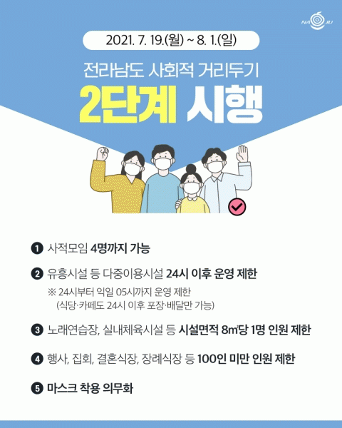 [¹Ìµð¾îÀü³² ¹Úº¹»ê ±âÀÚ] ³ªÁֽô Äڷγª19 °¨¿° ¿¹¹æ°ú Áö¿ª»çȸ È®»ê ¹æÁö¸¦ À§ÇÑ Àü¶ó³²µµ ÇàÁ¤¸í·É¿¡ µû¶ó 8¿ù 1ÀϱîÁö ¡®»çȸÀû °Å¸®µÎ±â °³Æí¾È 2´Ü°è¡¯¸¦ Àû¿ë¡¤½ÃÇàÇÑ´Ù°í 19ÀÏ ¹àÇû´Ù. ÀÌ¿¡ µû¶ó »çÀû¸ðÀÓÀº ¡®4¸í ±îÁö¡¯ Ç㡦