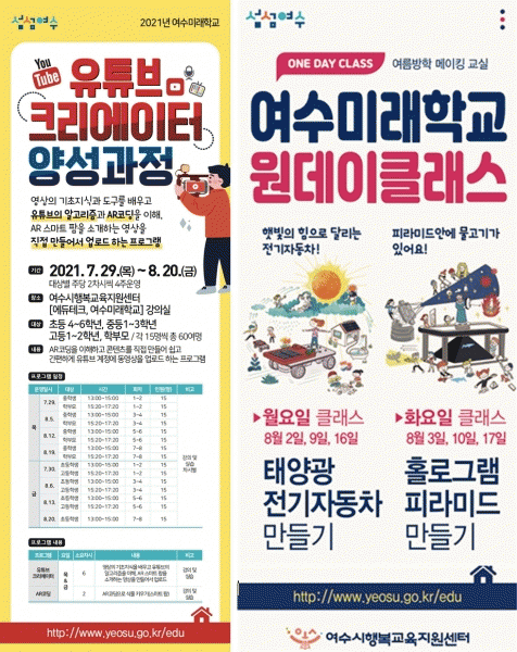 [¹Ìµð¾îÀü³² ÀüÇü¼º ±âÀÚ] ¿©¼ö½Ã´Â ¿©¼ö½ÃÇູ±³À°Áö¿ø¼¾ÅÍ ¿©¼ö¹Ì·¡Çб³¿¡¼ Çлý°ú ÇкθðµéÀÌ ´Ù¾çÇÑ ¹Ì·¡±â¼úÀ» üÇèÇÒ ¼ö ÀÖµµ·Ï ¿©¸§¹æÇРƯ°À» ¿î¿µÇÑ´Ù. ¹Ì·¡±â¼ú±³À°À» ±â¹ÝÇÑ ¡®À¯Æ©ºêÅ©¸®¿¡ÀÌÅÍ ¾ç¼º°úÁ¤¡¯°ú ¡®¿øµ¥ÀÌ Å¬¡¦