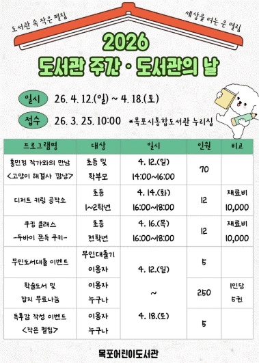 [¹Ìµð¾îÀü³² °í±Ô¼® ±âÀÚ]¸ñÆ÷¾î¸°À̵µ¼°üÀº 2026³â µµ¼°üÀÇ ³¯ ¹× µµ¼°ü ÁÖ°£À» ¸Â¾Æ Áö¿ª ÁÖ¹ÎÀ» À§ÇÑ ´Ùä·Î¿î µ¶¼¹®È ÇÁ·Î±×·¥À» ¿î¿µÇÑ´Ù. ÁÖ¿ä Çà»ç·Î´Â ¡®È«¹ÎÁ¤ ÀÛ°¡¿ÍÀÇ ¸¸³² '°í¾çÀÌ ÇØ°á»ç ±ô³É'¡¯, ¡®µðÀúÆ® ۸µ °øÀÛ¡¦