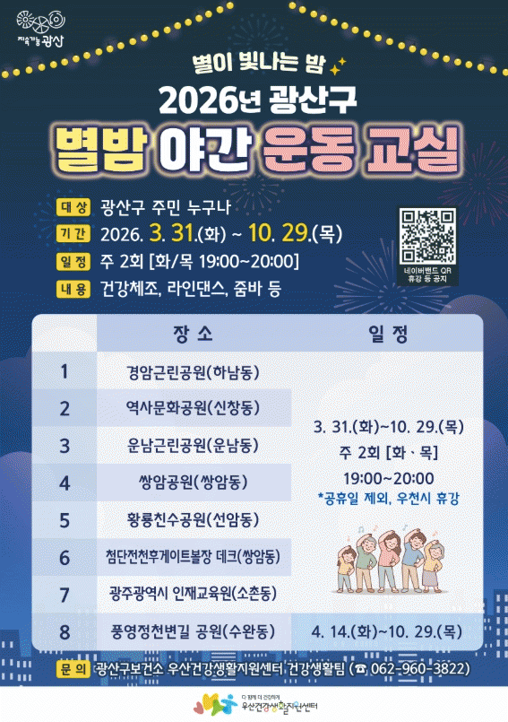 [¹Ìµð¾îÀü³² Á¦°¥´ëÁ¾ ±âÀÚ]±¤ÁÖ ±¤»ê±¸°¡ °Ç°ÇÑ ½ÅüȰµ¿ ȯ°æÀ» Á¶¼ºÇϰí Áö¿ª ÁֹεéÀÌ ±ÔÄ¢ÀûÀÎ ¿îµ¿½À°ü Çü¼ºÀ» À§ÇØ ¡®º°¹ã¾ß°£¿îµ¿±³½Ç¡¯À» ¿î¿µÇÑ´Ù. º°¹ã¾ß°£¿îµ¿±³½ÇÀº ³²³à³ë¼Ò ´©±¸³ª ¹«·á·Î Âü¿©ÇÒ ¼ö ÀÖ´Â °Ç° üÁ¶·Î, ±¤¡¦