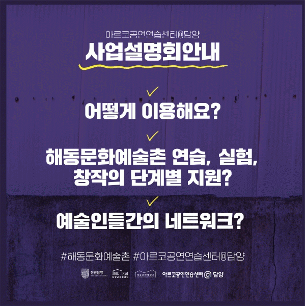 [¹Ìµð¾îÀü³² Á¦°¥´ëÁ¾ ±âÀÚ] Áö¿ª ³» ¹«´ë°ø¿¬ ¿¹¼úÀÇ È°¼ºÈ¸¦ À§ÇØ ¹®À» ¿¬ ¡®¾Æ¸£ÄÚ°ø¿¬¿¬½À¼¾ÅÍ@´ã¾ç¡¯¿¡¼ ¿¹¼úÀεéÀÇ È°¹ßÇÑ Âü¿©¸¦ À¯µµÇϱâ À§ÇØ ¿À´Â 30ÀÏ »ç¾÷¼³¸íȸ¸¦ °³ÃÖÇÑ´Ù. ´ã¾ç±º¹®ÈÀç´Ü ÇØµ¿¹®È¿¹¼úÃÌ ³» ÆóÁÖÁ¶À塦