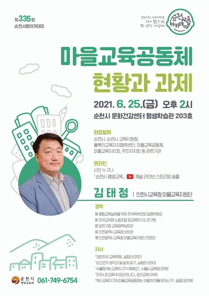 [¹Ìµð¾îÀü³² ÀÓ¼º¿Ï ±âÀÚ] ¼øÃµ½Ã´Â ¿À´Â 25ÀÏ ¿ÀÈÄ 2½Ã ¼øÃµ½Ã Æò»ýÇнÀ°ü¿¡¼ ¡®¸¶À» ±³À°°øµ¿Ã¼ ÇöȲ°ú °úÁ¦¡¯¶ó´Â ÁÖÁ¦·Î ¼øÃµ»ç¶û¾ÆÄ«µ¥¹Ì¸¦ °³ÃÖÇÑ´Ù. À̹ø °¿¬Àº ÀÎõ±¤¿ª½Ã±³À°Ã» ±èÅÂÁ¤ Àü¹®°ü°ú ÇÔ²² Çб³±³À°ÀÇ ÇÑ°è ±Øº¹À»¡¦