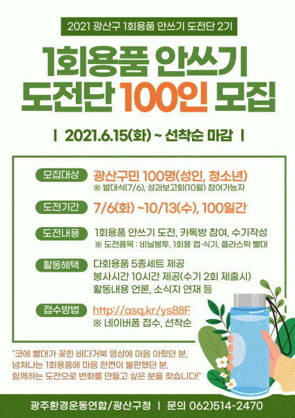 [¹Ìµð¾îÀü³² ±èÁ¤¿ì ±âÀÚ] ±¤ÁÖ ±¤»ê±¸°¡ ¿ÃÇØ 1ȸ¿ëǰ ¾È¾²±â µµÀü¿¡ Âü¿©ÇÒ 100ÀÎÀÇ ½Ã¹ÎµµÀü´ÜÀ» ¸ðÁýÇÑ´Ù. ½Ã¹ÎµµÀü´ÜÀº 7¿ùºÎÅÍ 10¿ù±îÁö 100Àϰ£ 1ȸ¿ëǰ »ç¿ëÇÏÁö ¾Ê±â¿¡ µµÀüÇÑ´Ù. ÀÌ ±â°£¿¡ 1ȸ¿ë ÄÅ, ºñ´Ò, »¡´ë µîÀ» »ç¿ë¡¦
