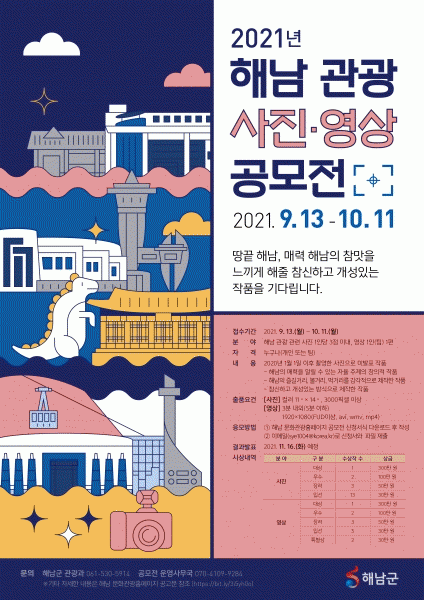 [¹Ìµð¾îÀü³² À±º¸Çö ±âÀÚ] ÇØ³²±ºÀº ÇØ³² °ü±¤ÀÇ ¼ûÀº ¸Å·ÂÀ» ¾Ë¸®°í °ü±¤°´µé¿¡°Ô È«º¸Çϱâ À§ÇÑ 2021 ÇØ³² °ü±¤ »çÁø¡¤¿µ»ó °ø¸ðÀüÀ» °³ÃÖÇÑ´Ù. ÀÛǰ ÁÖÁ¦´Â ÇØ³²ÀÇ ¸Å·ÂÀ» ¾Ë¸± ¼ö ÀÖ´Â ÀÚÀ² ÁÖÁ¦ÀÇ Ã¢ÀÇÀû ÀÛǰ, ÇØ³²ÀÇ Áñ±æ°Å¸®¡¤º¼¡¦
