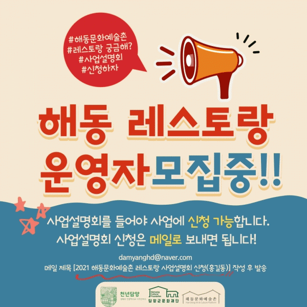 [¹Ìµð¾îÀü³² Á¦°¥´ëÁ¾ ±âÀÚ] ´ã¾ç±º¹®ÈÀç´Ü ÇØµ¿¹®È¿¹¼úÃÌ¿¡¼ Áö³ 1ÀϺÎÅÍ Ã»³â â¾÷ÀÎÀÇ Çö½ÇÀûÀΠâ¾÷À» Áö¿øÇϱâ À§ÇØ ¡®2021 ÇØµ¿¹®È¿¹¼úÃÌ ·¹½ºÅä¶û¡¯ ¿î¿µÀÚ¸¦ ¸ðÁýÇϰí ÀÖ´Ù. ¸ðÁý´ë»óÀº ¸¸ 39¼¼ ÀÌÇÏÀÇ Á÷Á¢ ¿î¿µÀÌ °¡´ÉÇÑ¡¦