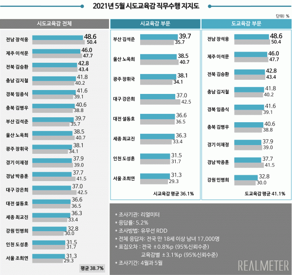 [¹Ìµð¾îÀü³² Á¦°¥´ëÁ¾ ±âÀÚ] Àå¼®¿õ Àü¶ó³²µµ±³À°°¨ÀÌ Á÷¹«¼öÇà ÁöÁöµµ 1À§ ÇàÁøÀ» 25°³¿ù·Î ´Ã·È´Ù. 8ÀÏ Àü¶ó³²µµ±³À°Ã»¿¡ µû¸£¸é, Àå¼®¿õ ±³À°°¨Àº ¿©·ÐÁ¶»ç±â°ü ¸®¾ó¹ÌÅͰ¡ ½Ç½ÃÇÑ ÁÖ¹ÎÁ÷¼± 3±â Àü±¹ 17°³ ½Ã¡¤µµ±³À°°¨ÀÇ 2021³â 5¿ù¡¦