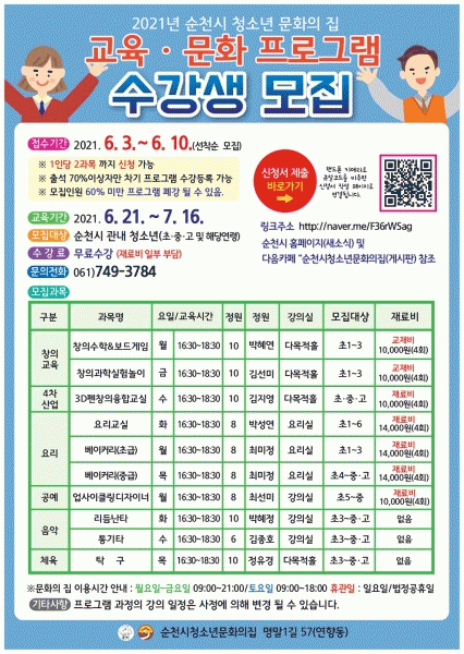 [¹Ìµð¾îÀü³² ÀÓ¼º¿Ï ±âÀÚ] ¼øÃµ½Ã´Â ¿À´Â 10ÀϱîÁö û¼Ò³â ¹®ÈÀÇ Áý ¡®Ã»¼Ò³â ±³À°¡¤¹®È¡¤°¡Á· ÇÁ·Î±×·¥¡¯¿¡ Âü¿©ÇÒ °ü³» ÃÊÁß°í û¼Ò³â 116¸íÀ» ¼±Âø¼øÀ¸·Î ¸ðÁýÇÑ´Ù. ÇÁ·Î±×·¥Àº ¿À´Â 21ÀϺÎÅÍ 7¿ù 16ÀϱîÁö ÃÑ 4ÁÖ°£ ÁøÇàµÇ¸ç ÁÖÁß¡¦