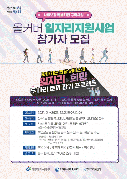 [¹Ìµð¾îÀü³² ±èÁ¤¿ì ±âÀÚ] ±¤ÁÖ µ¿±¸´Â º¸°Çº¹ÁöºÎ °ø¸ð¿¡ ¼±Á¤µÈ »çȸº¸À寝º°Áö¿ø±¸¿ª»ç¾÷ ´ë»ó Áö¿ªÀÎ »ê¼ö1µ¿¡¤°è¸²1µ¿ ÁֹεéÀÇ Ãë¾÷³ ÇØ¼Ò¸¦ À§ÇÑ ¡®Ã£¾Æ°¡´Â ÀÏÀÚ¸® »ó´ã ¹× Ãë¾÷ ¿¬°è ¼ºñ½º¡¯¸¦ ½ÃÀÛÇÑ´Ù°í ¹àÇû´Ù. µ¿±¸´Â »ç¡¦