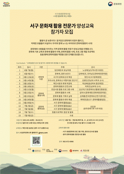 [¹Ìµð¾îÀü³² ±èÁ¤¿ì ±âÀÚ] ±¤ÁÖ ¼±¸°¡ 2021 ¼±¸ »ý»ý¹®ÈÀç»ç¾÷ÀÇ ÀÏȯÀ¸·Î Áö¿ª ¹®ÈÀç Ȱ¿ëÀ» À§ÇÑ Àü¹®°¡¸¦ ¾ç¼ºÇÏ´Â ±³À°À» ½Ç½ÃÇÑ´Ù. À̹ø ¾ç¼º±³À°Àº ±¤ÁÖ¹®È³ª·ç ÁÖ°üÀ¸·Î dz¾Ïµ¿¿¡ ÀÖ´Â º®Áø¼¿ø¿¡¼ ½Ç½ÃÇÑ´Ù. 2015³â¡¦