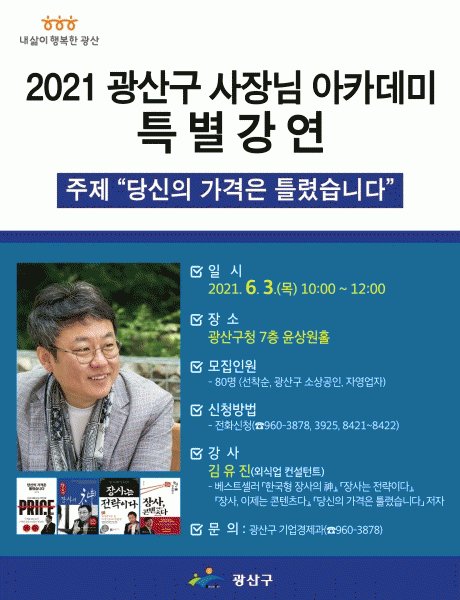 [¹Ìµð¾îÀü³² ±èÁ¤¿ì ±âÀÚ] ±¤ÁÖ ±¤»ê±¸°¡ ¿À´Â 6¿ù3ÀÏ °³ÃÖÇÏ´Â ¡®Àå»çÀÇ ½Å¡¯ Ưº°°¿¬¿¡ Âü¼®ÇÒ ÀÚ¿µ¾÷ÀÚ¸¦ ¸ðÁýÇÑ´Ù. ±¤»ê±¸¿¡ µû¸£¸é, À̹ø °¿¬Àº ¡®´ç½ÅÀÇ °¡°ÝÀº Ʋ·È½À´Ï´Ù¡¯¸¦ ÁÖÁ¦·Î 6¿ù3ÀÏ ±¤»ê±¸Ã» 7Ãþ À±»ó¿øÈ¦¿¡¼ ¿¸± ¡¦