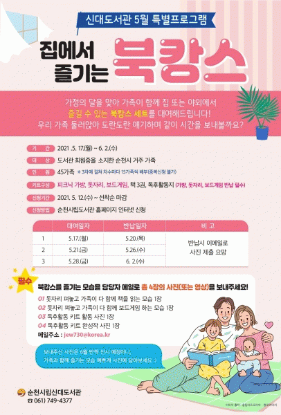 [¹Ìµð¾îÀü³² ÀÓ¼º¿Ï ±âÀÚ] ¼øÃµ½Ã´Â °¡Á¤ÀÇ ´ÞÀ» ¸Â¾Æ ¿À´Â 17ÀϺÎÅÍ ¡®Áý¿¡¼ Áñ±â´Â ºÏIJ½º¡¯ ÇÁ·Î±×·¥À» ¿î¿µÇÑ´Ù. ¼øÃµ½Ã¸³ ½Å´ëµµ¼°üÀº °¡Á·Æ¯Èµµ¼°üÀ¸·Î½á ºÎ¸ð±³À° ¹× °¡Á·Ã¼Çè ÇÁ·Î±×·¥À» ÁøÇàÇϰí ÀÖ´Ù. ¿ÃÇØ´Â Äڷγª19·Î¡¦