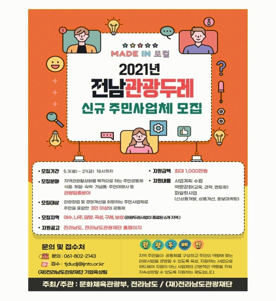 [¹Ìµð¾îÀü³² Á¦°¥´ëÁ¾ ±âÀÚ] Àü¶ó³²µµ°¡ ¡®2021 Àü³² °ü±¤µÎ·¹Áö¿ªÇù·Â»ç¾÷¿¡ Âü¿©ÇÒ ½Å±Ô Áֹλç¾÷ü¡¯¸¦ ¿À´Â 21ÀϱîÁö ¸ðÁýÇÑ´Ù. ¹®ÈüÀ°°ü±¤ºÎ¿Í Àü³²µµ°¡ ÁÖÃÖÇϰí Àü³²°ü±¤Àç´ÜÀÌ ÁÖ°üÇÏ´Â Àü³² °ü±¤µÎ·¹Áö¿ªÇù·Â»ç¾÷Àº ½Å±Ô ÁֹΡ¦