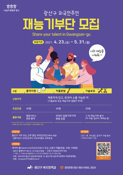 [¹Ìµð¾îÀü³² ±èÁ¤¿ì ±âÀÚ] ±¤ÁÖ ±¤»ê±¸°¡ ¿Ü±¹ÀÎÁֹεéÀÌ Áö¿ª»çȸ¸¦ À§ÇØ ¸¶À½²¯ Àç´ÉÀ» ÆîÄ¥ ¼ö ÀÖµµ·Ï Áö¿øÇÑ´Ù. ±¤»ê±¸´Â ÀÌ´Þ 31ÀϱîÁö ±¤»ê±¸ ¿Ü±¹ÀÎÁֹΠÀç´É±âºÎ´ÜÀ» ¸ðÁýÇÑ´Ù°í ¹àÇû´Ù. ±¤»ê±¸´Â ÀÛ³â 4¿ù Äڷγª19 »óȲ¿¡¼ ¡¦
