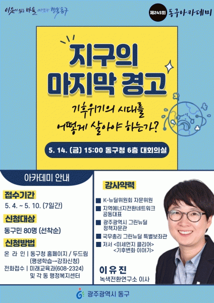 [¹Ìµð¾îÀü³² ±èÁ¤¿ì ±âÀÚ] ±¤ÁÖ µ¿±¸´Â ÀÌÀ¯Áø ³ì»öÀüȯ¿¬±¸¼Ò ¿¬±¸¿ø À̻縦 ÃÊûÇÑ 5¿ù µ¿±¸¾ÆÄ«µ¥¹Ì¸¦ °³ÃÖÇÑ´Ù°í ¹àÇû´Ù. ¿À´Â 14ÀÏ ¿ÀÈÄ 3½Ã ±¸Ã» 6Ãþ ´ëȸÀǽǿ¡¼ ¿¸®´Â À̹ø °¿¬ ÁÖÁ¦´Â ¡®Áö±¸ÀÇ ¸¶Áö¸· °æ°í ±âÈÄ À§±âÀÇ ½Ã´ë¡¦