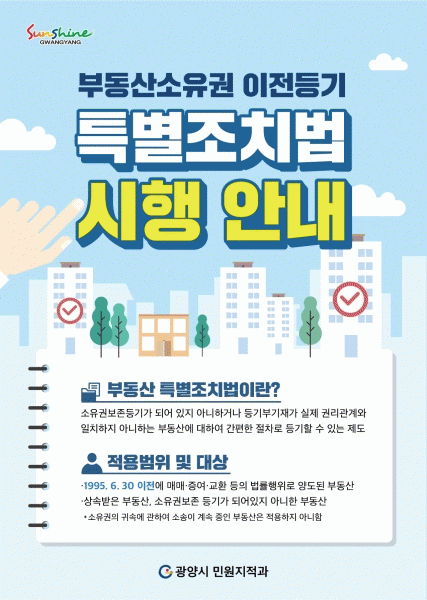 [¹Ìµð¾îÀü³² ÀÓ¼º¿Ï ±âÀÚ] ±¤¾ç½Ã´Â Áö³ÇØ¿¡ ÀÌ¾î ¿ÃÇØµµ ¡®ºÎµ¿»ê¼ÒÀ¯±Ç ÀÌÀüµî±â µî¿¡ °üÇÑ Æ¯º°Á¶Ä¡¹ý¡¯ ÃßÁø¿¡ ¹ÚÂ÷¸¦ °¡Çϰí ÀÖ´Ù. ½Ã´Â ÇöÀç±îÁö ÅäÁö 234ÇÊÁö¸¦ Á¢¼öÇØ 132ÇÊÁö¿¡ °üÇÑ È®Àμ ¹ß±Þ °ø°í µî ¹Î¿øÃ³¸®¸¦ ¿Ï·áÇß´Ù¡¦