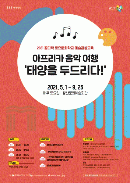 [¹Ìµð¾îÀü³² ±èÁ¤¿ì ±âÀÚ] ±¤»ê±¸°¡, ¾ÆÇÁ¸®Ä« ¸®µëÀ¸·Î ¿¹¼úÀ» ¹è¿ì°í °¨»óÇÏ´Â, ¡®¾ÆÇÁ¸®Ä« À½¾Ç¿©Çà žçÀ» µÎµå¸®´Ù¡¯ ÇÁ·Î±×·¥¿¡ Âü¿©ÇÒ 1±â ¼ö°»ý 50¸íÀ» À̹ø´Þ 27ÀϱîÁö ¼±Âø¼ø ¸ðÁýÇÑ´Ù. ¹®È¿¹¼ú°øµ¿Ã¼ ¡®¿ï¸²¡¯ÀÌ ±¤»ê¹®¿¹¡¦