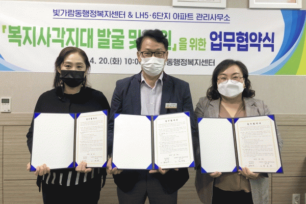 [¹Ìµð¾îÀü³² ¹Úº¹»ê ±âÀÚ] ³ªÁֽà ºû°¡¶÷µ¿°ú ºû°¡¶÷LH5¡¤6´ÜÁö¾ÆÆÄÆ®°¡ »ý°èÀ§±â°¡±¸ÀÇ ¼±Á¦Àû ¹ß±¼À» À§ÇØ ¼ÕÀ» ¸ÂÀâ¾Ò´Ù. ºû°¡¶÷µ¿Àº Áö³ 20ÀÏ LH5¡¤6´ÜÁö¾ÆÆÄÆ® °ü¸®»ç¹«¼Ò¿Í ¡®º¹Áö»ç°¢Áö´ë ¹ß±¼ ¹× Áö¿øÀ» À§ÇÑ ¾÷¹«Çù¾à¡¯À» ü¡¦