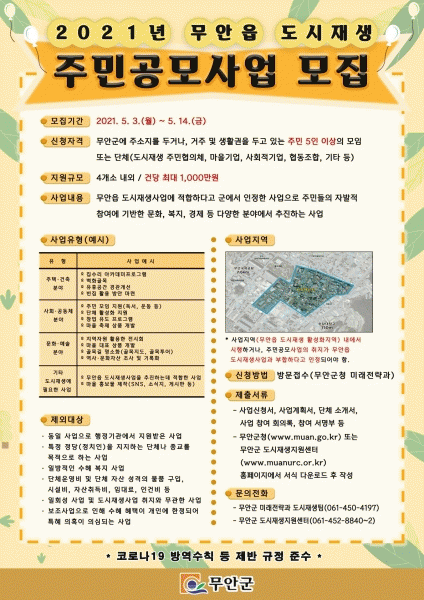 [¹Ìµð¾îÀü³² Á¦°¥´ëÁ¾ ±âÀÚ] ¹«¾È±ºÀº ÁֹΠÁ¶Á÷Ȱµ¿ Áö¿øÀ» ÅëÇÑ °øµ¿Ã¼ Ȱ¼ºÈ ±â¹Ý ¸¶·ÃÀ» À§ÇØ ¹«¾ÈÀ¾ µµ½ÃÀç»ý Áֹΰø¸ð»ç¾÷ Âü°¡´Üü¸¦ ¸ðÁýÇÑ´Ù°í ¹àÇû´Ù. µµ½ÃÀç»ý Áֹΰø¸ð»ç¾÷Àº ¹«¾ÈÀ¾ ÀÏ´ëÀÇ °¢Á¾ ÀÎÇÁ¶ó È®Ãæ°ú Áֹοª·® °¡¦