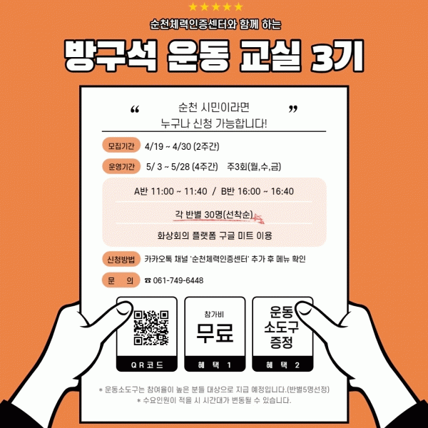 [¹Ìµð¾îÀü³² ÀüÇü¼º ±âÀÚ] ¼øÃµ½Ã´Â ¿À´Â 4¿ù 30ÀϱîÁö ºñ´ë¸é ü·ÂÁõÁø ±³½ÇÀÎ ¡®¹æ±¸¼® ¿îµ¿ ±³½Ç¡¯ 3±â¸¦ ¸ðÁýÇÑ´Ù. Áö³ 4¿ù 16ÀϱîÁö 2±â¸¦ ¸¶Ä£ ¹æ±¸¼® ¿îµ¿ ±³½ÇÀº Äڷγª19·Î ÁöÄ£ ½Ã¹ÎµéÀ» À§ÇØ ºñ´ë¸é ¿îµ¿±³½Ç°ú ¿Â¶óÀÎ ¿îµ¿¡¦