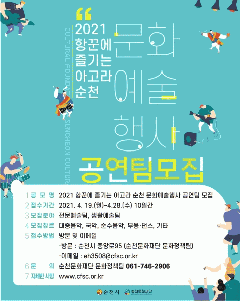 [¹Ìµð¾îÀü³² ÀüÇü¼º ±âÀÚ] ¼øÃµ¹®ÈÀç´ÜÀº Áö¿ª ¹®È¿¹¼úÀεéÀÇ È°µ¿±â¹Ý °È¿Í ½Ã¹Î ¹®È ÇâÀ¯±âȸ È®´ë¸¦ À§ÇÑ ¡®2021 Çײۿ¡ Áñ±â´Â ¾Æ°í¶ó ¼øÃµ¡¯°ø¿¬ÆÀÀ» 4¿ù 28ÀϱîÁö °ø°³ ¸ðÁýÇÑ´Ù. À̹ø °ø¿¬ÆÀ °ø¸ð´Â ¼øÃµ½Ã °ÅÁÖÀÚ·Î °ø¿¬ ¡¦