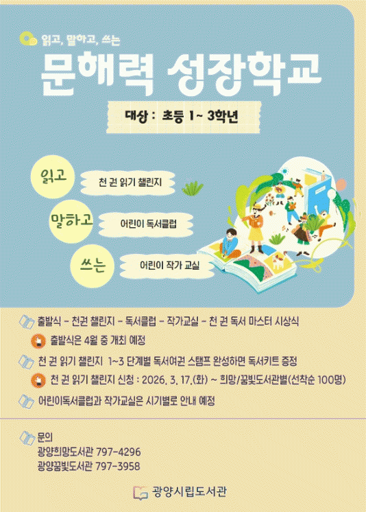 [¹Ìµð¾îÀü³² ÀÓ¼º¿Ï ±âÀÚ] ±¤¾ç½Ã´Â ¾î¸°À̵éÀÇ ±âÃÊÇнÀ ¿ª·®ÀÎ ¹®ÇØ·ÂÀ» ³ôÀ̱â À§ÇØ 4¿ùºÎÅÍ ±¤¾çÈñ¸Áµµ¼°ü°ú ±¤¾ç²Þºûµµ¼°ü¿¡¼ ¡®¹®ÇØ·Â ¼ºÀåÇб³¡¯¸¦ ¿î¿µÇÑ´Ù. À̹ø »ç¾÷Àº µðÁöÅÐ ¸Åü ÀÌ¿ë Áõ°¡·Î ¾î¸°À̵éÀÇ µ¶¼ ½Ã°£ÀÌ ÁÙ¡¦