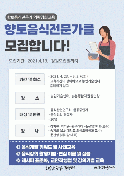 [¹Ìµð¾îÀü³² Á¦°¥´ëÁ¾ ±âÀÚ] ȼø±ºÀÌ 13ÀϺÎÅÍ ÇâÅäÀ½½Ä Àü¹®°¡ ¿ª·® °È ±³À°¿¡ Âü¿©ÇÒ ¼ö°»ý 20¸íÀ» ¸ðÁýÇÑ´Ù. ±º ³ó¾÷±â¼ú¼¾ÅÍ´Â À̹ø ±³À°À» ÅëÇØ Áö¿ª ³ó»ê¹°À» Ȱ¿ëÇÑ À½½Ä °³¹ß°ú ¿Ã¹Ù¸¥ ½Ä¹®È Çü¼ºÀ» ¼±µµÇÒ ÇâÅäÀ½½Ä Àü¹®°¡¡¦