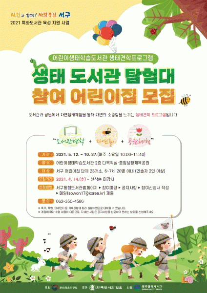 [¹Ìµð¾îÀü³² ±èÁ¤¿ì ±âÀÚ] ±¤ÁÖ ¼±¸°¡ °ü³» ¾î¸°ÀÌÁý 23°³¼Ò¸¦ ´ë»óÀ¸·Î ¡®»ýÅ µµ¼°ü ŽÇè´ë¡¯Âü¿© ¾î¸°ÀÌÁýÀ» ¸ðÁýÇÑ´Ù. ¡®»ýÅ µµ¼°ü ŽÇè´ë¡¯´Â ¾î¸°ÀÌ»ýÅÂÇнÀµµ¼°ü°ú dz¾Ï»ýȰüÀ°°ø¿ø¿¡¼ ÀÚ¿¬»ýű³À°À» °æÇèÇϸç ÀÚ¿¬ÀÇ ¼Ò¡¦