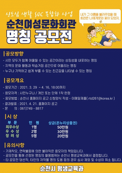 [¹Ìµð¾îÀü³² ÀüÇü¼º ±âÀÚ] ¼øÃµ½Ã´Â ¿À´Â 4¿ù 16ÀϱîÁö ½Ã¹Î´©±¸³ª ¸ðµÎ°¡ ÀÌ¿ë ÇÒ ¼ö ÀÖ´Â Áö¿ªÀÇ ¹®È Ȱµ¿ °ø°£°ú ÇнÀ°ÅÁ¡À¸·Î½á ÀǹÌÀÖ´Â ¼øÃµ½Ã¿©¼º¹®Èȸ°üÀÇ »õ ¸íĪÀ» °ø¸ðÇÑ´Ù. ½Ã´Â ¹®ÈüÀ°°ü±¤ºÎ 2021³âµµ »ýȰSOC º¹ÇÕÈ¡¦