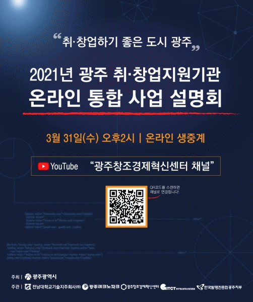 [¹Ìµð¾îÀü³² Á¦°¥´ëÁ¾ ±âÀÚ] ±¤ÁÖ±¤¿ª½Ã´Â Áö¿ª â¾÷Áö¿ø À¯°ü±â°üÀÌ ÇÑÀÚ¸®¿¡¼ ¿ÃÇØ ÃßÁøÇÏ´Â »ç¾÷À» ¼³¸íÇÏ´Â ¡®2021³â â¾÷Áö¿ø±â°ü ÅëÇÕ»ç¾÷¼³¸íȸ¡¯¸¦ 31ÀÏ ¿ÀÈÄ 2½Ã À¯Æ©ºê ¡®±¤ÁÖâÁ¶°æÁ¦Çõ½Å¼¾ÅÍ¡¯ ä³ÎÀ» ÅëÇØ ¿Â¶óÀÎÀ¸·Î °³ÃÖ¡¦