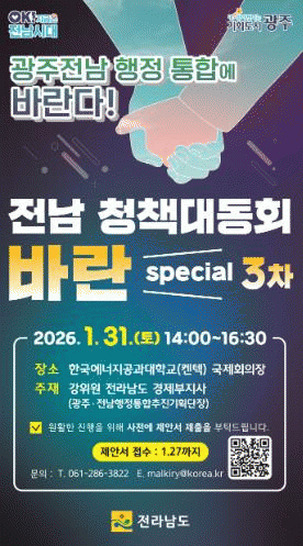 [¹Ìµð¾îÀü³² Á¦°¥´ëÁ¾ ±âÀÚ]Àü¶ó³²µµ´Â ¿À´Â 31ÀÏ ¿ÀÈÄ 2½Ã Çѱ¹¿¡³ÊÁö°ø°ú´ëÇб³ ±¹Á¦È¸ÀÇÀå¿¡¼ Àü³² ûå´ëµ¿È¸ ¡®¹Ù¶õ¡¯À» °³ÃÖÇÑ´Ù. À̹ø Çà»ç´Â Áß´ëÇÑ Áö¿ª Çö¾ÈÀÎ ¡®±¤ÁÖ¡¤Àü³² ÇàÁ¤ÅëÇÕ¿¡ ¹Ù¶õ´Ù¡¯¸¦ ÁÖÁ¦·Î, ÅëÇÕ °ü·Ã ÁúÀÇÀÀ¡¦