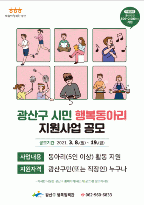 [¹Ìµð¾îÀü³² ±èÁ¤¿ì ±âÀÚ]±¤ÁÖ±¤¿ª½Ã ±¤»ê±¸°¡ 19ÀϱîÁö 2021 ½Ã¹ÎÇູµ¿¾Æ¸® Áö¿ø»ç¾÷ ´ë»ó ´Üü¸¦ ¸ðÁýÇÑ´Ù. ½Ã¹ÎÀÌ Ãë¹Ì¡¤ÃëÇâ Áß½ÉÀ¸·Î ¼ÒÅëÇϰí, °øµ¿Ã¼ Ȱµ¿À¸·Î ÇູÀ» ´À³¥ ¼ö ÀÖµµ·Ï Áö¿øÇÏ´Â °ÍÀÌ À̹ø Áö¿ø»ç¾÷ÀÇ °ñÀÚ. ±¤¡¦