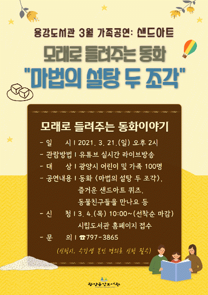 [¹Ìµð¾îÀü³² ÀüÇü¼º ±âÀÚ]±¤¾ç¿ë°µµ¼°üÀÌ ¿Â °¡Á·ÀÌ ÇÔ²² °ü¶÷ÇÒ ¼ö ÀÖ´Â »÷µå¾ÆÆ® °ø¿¬ ¡®¸ð·¡·Î µé·ÁÁÖ´Â µ¿ÈÀ̾߱⡯¸¦ ÁغñÇß´Ù. ¡®¸ð·¡·Î µé·ÁÁÖ´Â µ¿ÈÀ̾߱⡯´Â ¿À´Â 3¿ù 29ÀÏ ¿ÀÈÄ 2½Ã À¯Æ©ºê¿¡¼ ½Ç½Ã°£ »ýÁß°è·Î ÁøÇàÇϸ硦