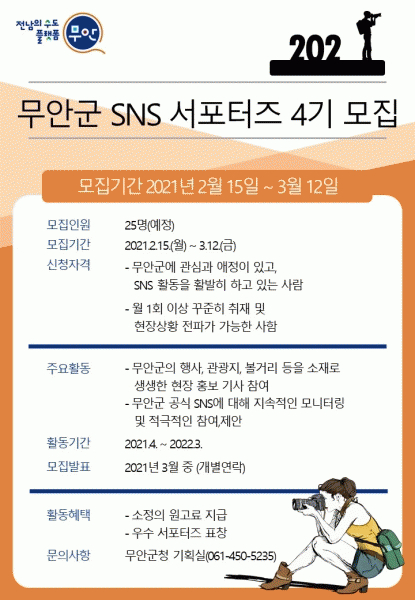 [¹Ìµð¾îÀü³² Á¦°¥´ëÁ¾ ±âÀÚ] ¹«¾È±ºÀº Áö³ 15ÀϺÎÅÍ ´ÙÀ½ ´Þ 12ÀϱîÁö ¹«¾È±ºÀÇ ¼û°ÜÁø ´Ù¾çÇÑ À̾߱⸦ Á÷Á¢ ¹ß±¼Çϰí Áö¿ª ¼Ò½ÄÀ» ¸¹Àº »ç¶÷µé¿¡°Ô »ýµ¿°¨ ÀÖ°Ô Àü´ÞÇÒ 'SNS ¼Æ÷ÅÍÁî' 25¸íÀ» ¸ðÁýÇÑ´Ù. ¸ðÁý ´ë»óÀº ¹«¾È±º¿¡ °ü½É¡¦