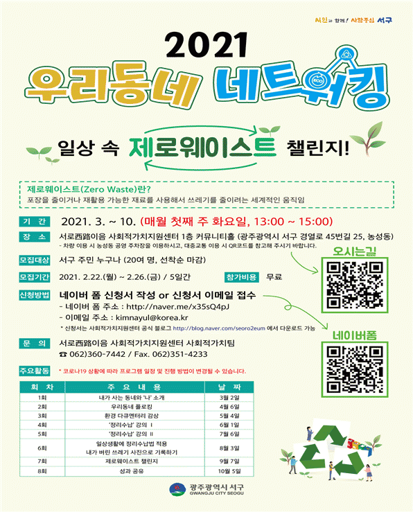 [¹Ìµð¾îÀü³² ±èÁ¤¿ì ±âÀÚ] ±¤ÁÖ ¼±¸ ¼·ÎÀÌÀ½ »çȸÀû°¡Ä¡Áö¿ø¼¾ÅͰ¡ ¿À´Â 22ÀϺÎÅÍ 26ÀϱîÁö 2021 ¿ì¸®µ¿³× ³×Æ®¿öÅ· ÇÁ·Î±×·¥ÀÇ Âü°¡ÀÚ¸¦ ½Åû Á¢¼ö¹Þ´Â´Ù. ÁÖÁ¦´Â ¡®ÀÏ»ó ¼Ó Á¦·Î¿þÀ̽ºÆ® ÿ¸°Áö¡¯·Î Æ÷ÀåÀ» ÁÙÀ̰ųª ÀçȰ¿ëÀÌ °¡´É¡¦