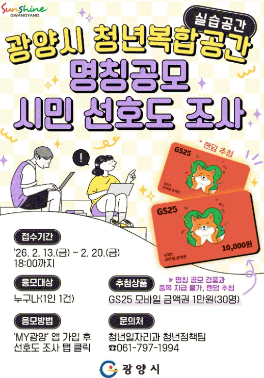 [¹Ìµð¾îÀü³² ÀÓ¼º¿Ï ±âÀÚ]±¤¾ç½Ã´Â ±¤¾çÀ¾ À¾³»¸®¿¡ Áذø ¿¹Á¤ÀÎ ¡®°íÇâ¿Ã·¡ û³âº¹ÇÕ°ø°£(½Ç½À°ø°£)¡¯ÀÇ °ø½Ä ¸íĪ ¼±Á¤À» À§ÇØ 2¿ù 13ÀϺÎÅÍ 2¿ù 20ÀϱîÁö ½Ã¹Î ¼±È£µµ Á¶»ç¸¦ ½Ç½ÃÇÑ´Ù°í ¹àÇû´Ù. À̹ø »ç¾÷Àº 2023³â ÇàÁ¤¾ÈÀüºÎ ÁÖ°ü¡¦