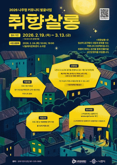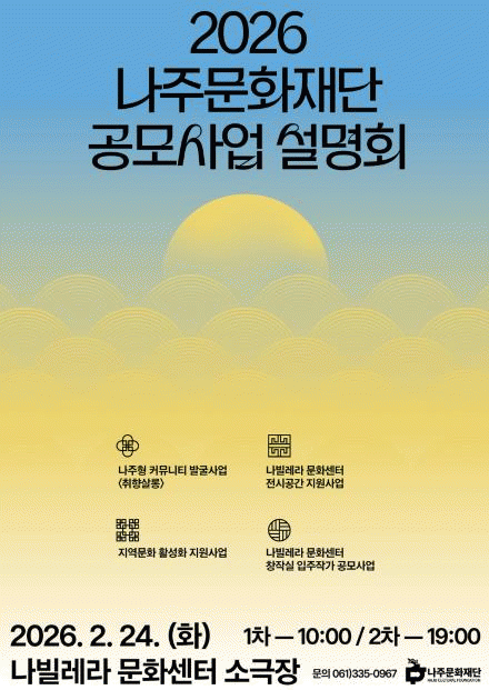 [¹Ìµð¾îÀü³² Á¦°¥´ëÁ¾ ±âÀÚ]³ªÁÖ¹®ÈÀç´ÜÀÌ 2026³âµµ¿¡ ÃßÁøÇÒ ¹®È»ç¾÷ Àü¹ÝÀ» ½Ã¹Î°ú °øÀ¯ÇÏ°í °ø¸ð Âü¿© ±âȸ¸¦ È®´ëÇϱâ À§ÇØ ¼³¸íȸ¸¦ °³ÃÖÇÑ´Ù. ³ªÁÖ¹®ÈÀç´ÜÀº ¿À´Â 2¿ù 24ÀÏ ³ªºô·¹¶ó¹®È¼¾ÅÍ ¼Ò±ØÀå¿¡¼ ¡®2026³â ³ªÁÖ¹®ÈÀç´Ü¡¦