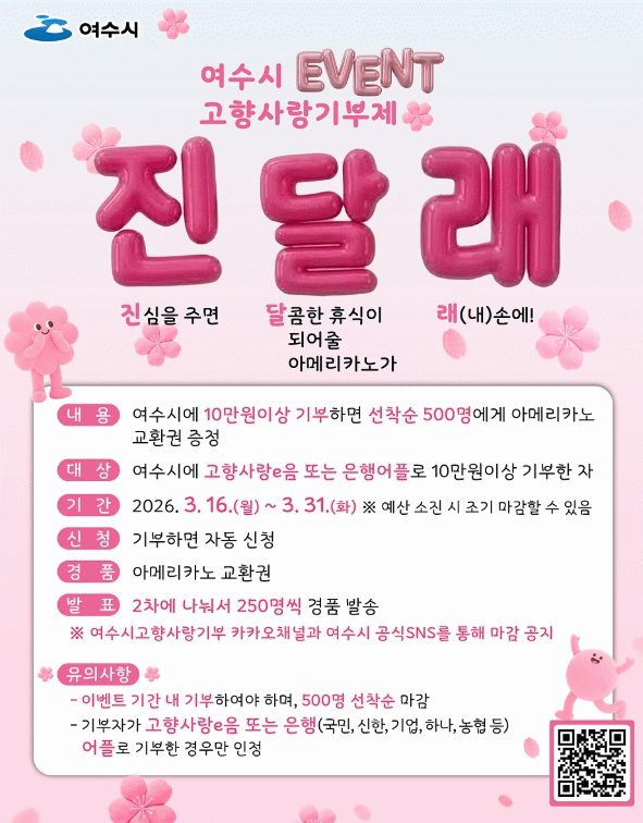[¹Ìµð¾îÀü³² ÀüÇü¼º ±âÀÚ] ¿©¼ö½Ã´Â º½À» ´ëÇ¥ÇÏ´Â ¿µÃë»ê Áø´Þ·¡ÃàÁ¦¸¦ ¸Â¾Æ Áö¿ª »ç¶û°ú °íÇâ»ç¶û±âºÎÁ¦ Âü¿© ºÐÀ§±â È®»êÀ» À§ÇØ 3¿ù 31ÀϱîÁö ¡®Áø½ÉÀ» ÁÖ¸é ´ÞÄÞÇÑ ÈÞ½ÄÀÌ µÇ¾îÁÙ ¾Æ¸Þ¸®Ä«³ë°¡ ·¡(³»)¼Õ¿¡(¾àĪ Áø¡¤´Þ¡¤·¡)¡¯ °íÇâ»ç¡¦