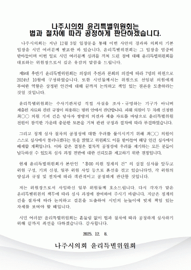 [¹Ìµð¾îÀü³² Á¦°¥´ëÁ¾ ±âÀÚ]³ªÁÖ½ÃÀÇȸ À±¸®Æ¯º°À§¿øÈ¸(À§¿øÀå ±èÁ¤¼÷)´Â 12¿ù 8ÀÏ, È«¡Û¡Û ÀÇ¿ø ¡°èÀÇ °Ç °ü·ÃÇÑ ½É»ç ÀýÂ÷°¡ ÁøÇàµÇ´Â °¡¿îµ¥ À§¿ø ±¸¼º, ±âÇÇ ½Åû, ÀϺΠÀ§¿ø »çÀÓ µîÀ¸·Î ³í¶õÀÌ À̾îÁø »óȲ°ú °ü·ÃÇØ ÀÔÀå¹®À» ¹ßÇ¥¡¦