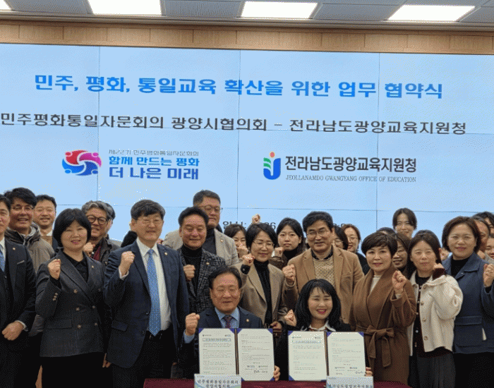 [¹Ìµð¾îÀü³² ÀÓ¼º¿Ï ±âÀÚ]¹ÎÁÖÆòÈÅëÀÏÀÚ¹®È¸ÀÇ ±¤¾ç½ÃÇùÀÇȸ(ȸÀå ¹Ú³ë½Å)´Â 2¿ù 9ÀÏ ¿ÀÈÄ 1½Ã Àü¶ó³²µµ±¤¾ç±³À°Áö¿øÃ»°ú ¡®¹ÎÁÖ¡¤ÆòÈ¡¤ÅëÀϱ³À° È®»êÀ» À§ÇÑ ¾÷¹«Çù¾à¡¯À» ü°áÇß´Ù. À̳¯ Çù¾à½Ä¿¡´Â ¾ç ±â°ü °ü°èÀÚ¿Í ÀÚ¹®À§¿ø µî 5¡¦