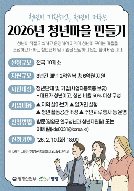 [¹Ìµð¾îÀü³² °í±Ô¼® ±âÀÚ]¿µ¾Ï±ºÀÌ ÇàÁ¤¾ÈÀüºÎ ¡®2026 û³â ¸¶À» ¸¸µé±â »ç¾÷¡¯¿¡ Âü¿©ÇÒ Ã»³â´Üü¸¦ ´ÙÀ½´Þ 10ÀϱîÁö °ø°³ ¸ðÁýÇÑ´Ù. û³âÀÌ ÀÏÁ¤ ±â°£ Áö¿ª¿¡ ¸Ó¹°¸ç ±âȹ¡¤½ÇÇàÇÑ È°µ¿À¸·Î °ü°è¸¦ ¸Î°í, Á¤Âø °¡´É¼ºÀ» ½ÇÇèÇϴ û³â¡¦